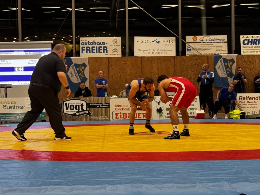 Im letzten Kampf des Abends trat Recep Topal gegen Roman Duscov auf den Ring. Nach einem 4:4 Stand kurz vor dem Ende, welches durch die höhere Wertung für Recep der Sieg wäre, gab der Kampfrichter einen Punkt für den Ringer aus Obereisesheim. Warum der Kampfrichter bei so einem Stand wenige Sekunde vor Abpfiff noch eine Wertung gab, konnte auch der Trainerstab um Recep sich nicht erklären.