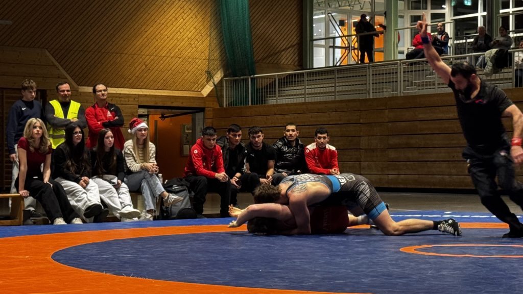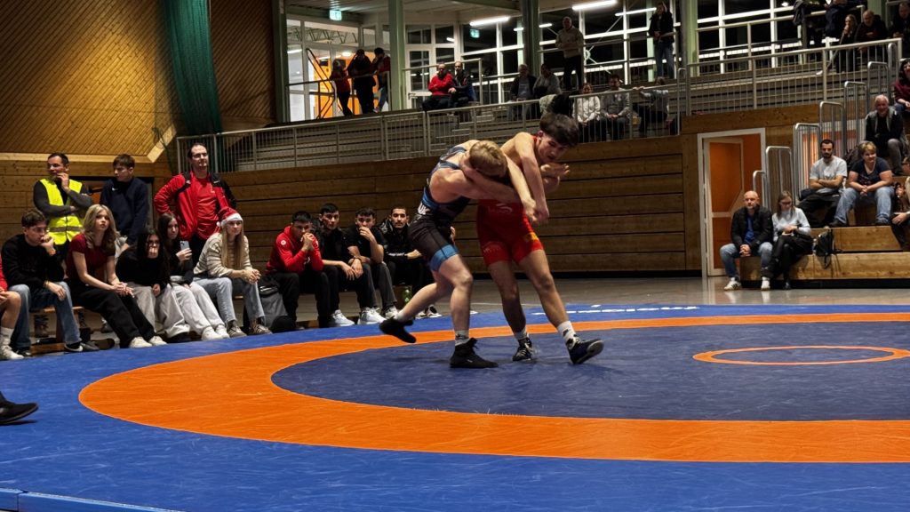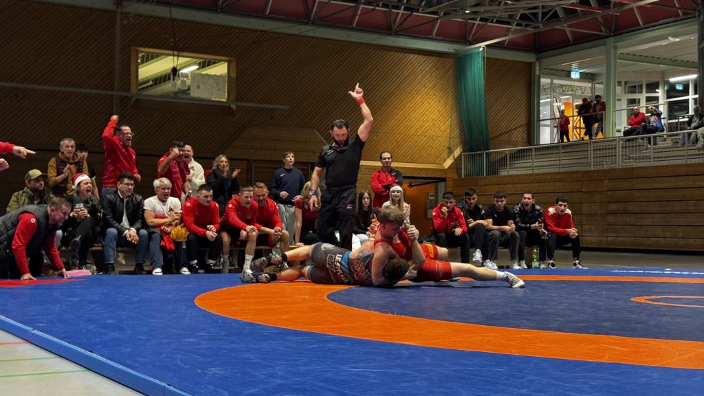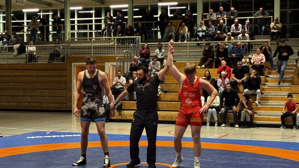 Samuel Puscas holte kampflos die ersten vier Punkte. Kurz darauf ließ Schwergewichtler Halil Meral die Halle beben – sein furioser 16:0-Sieg in nur 51 Sekunden war ein echtes Ausrufezeichen. Trotz einer starken kämpferischen Leistung von Konstantin Wamboldt musste dieser seinen Kampf abgeben. Doch Romio Koch drehte anschließend ein wildes Duell und schulterte seinen Gegner nach mehreren Führungswechseln. Noel Meikel Remmele sorgte mit konzentriertem Griffkampf und einem klaren Schultersieg für eine verdiente Pausenführung von 16:3.